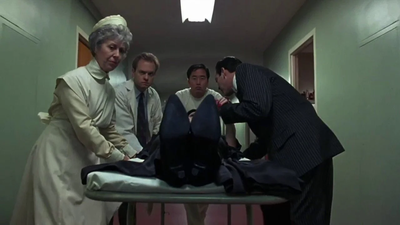 Cut to the hospital! Morticia is wheeled down the hall, Gomez gripping her hand.