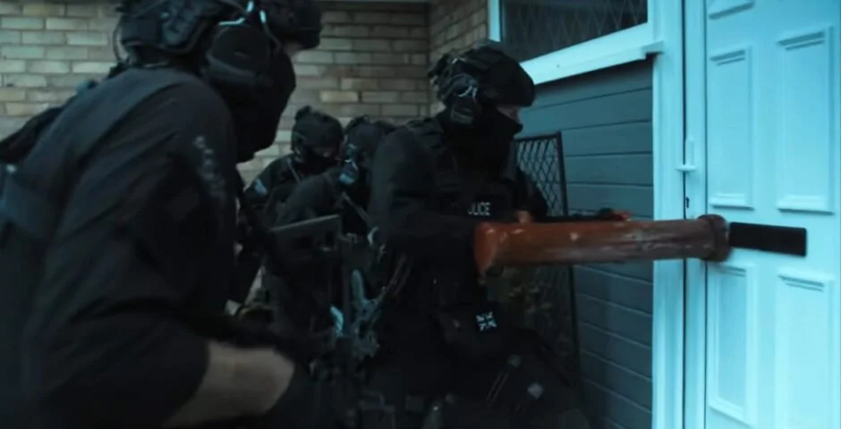 Chaos ensues as the family is jolted out of their routine. Inside, everything feels small. Domestic. Ordinary. That illusion shatters almost instantly as officer’s move through the house, calling out, clearing rooms, asserting presence.