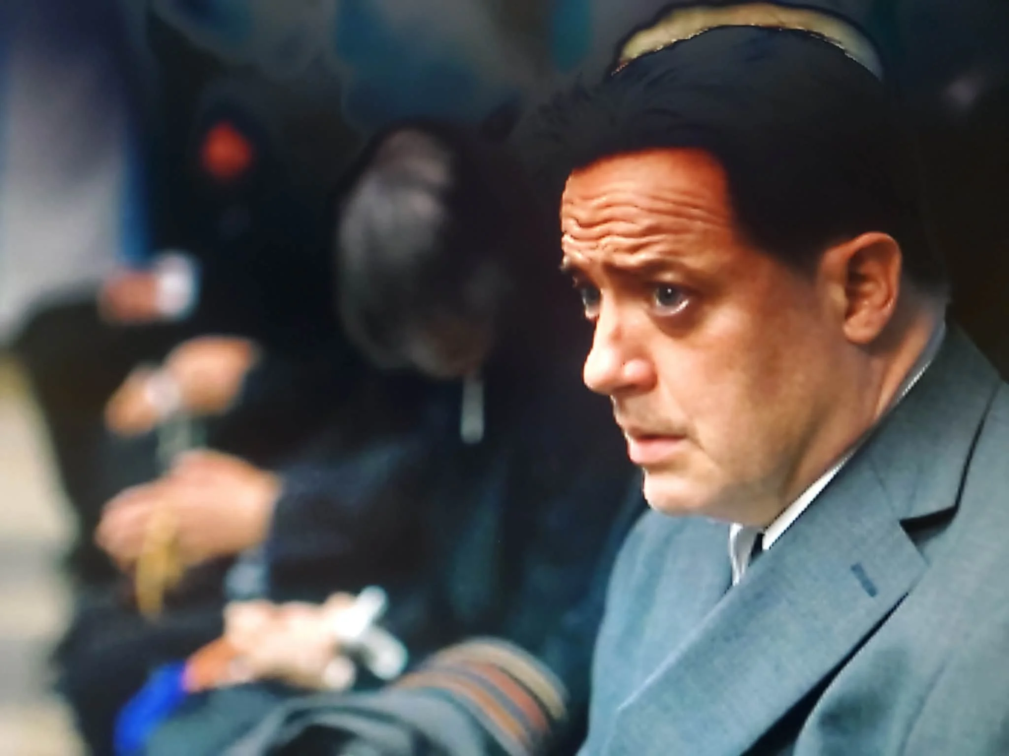 Not a great look, but juggling public transportation can be complicated at times. He steps into the room in a somber black suit carrying a brief case to discover that the role of “Sad American” means that he is attending what appears to be a funeral!